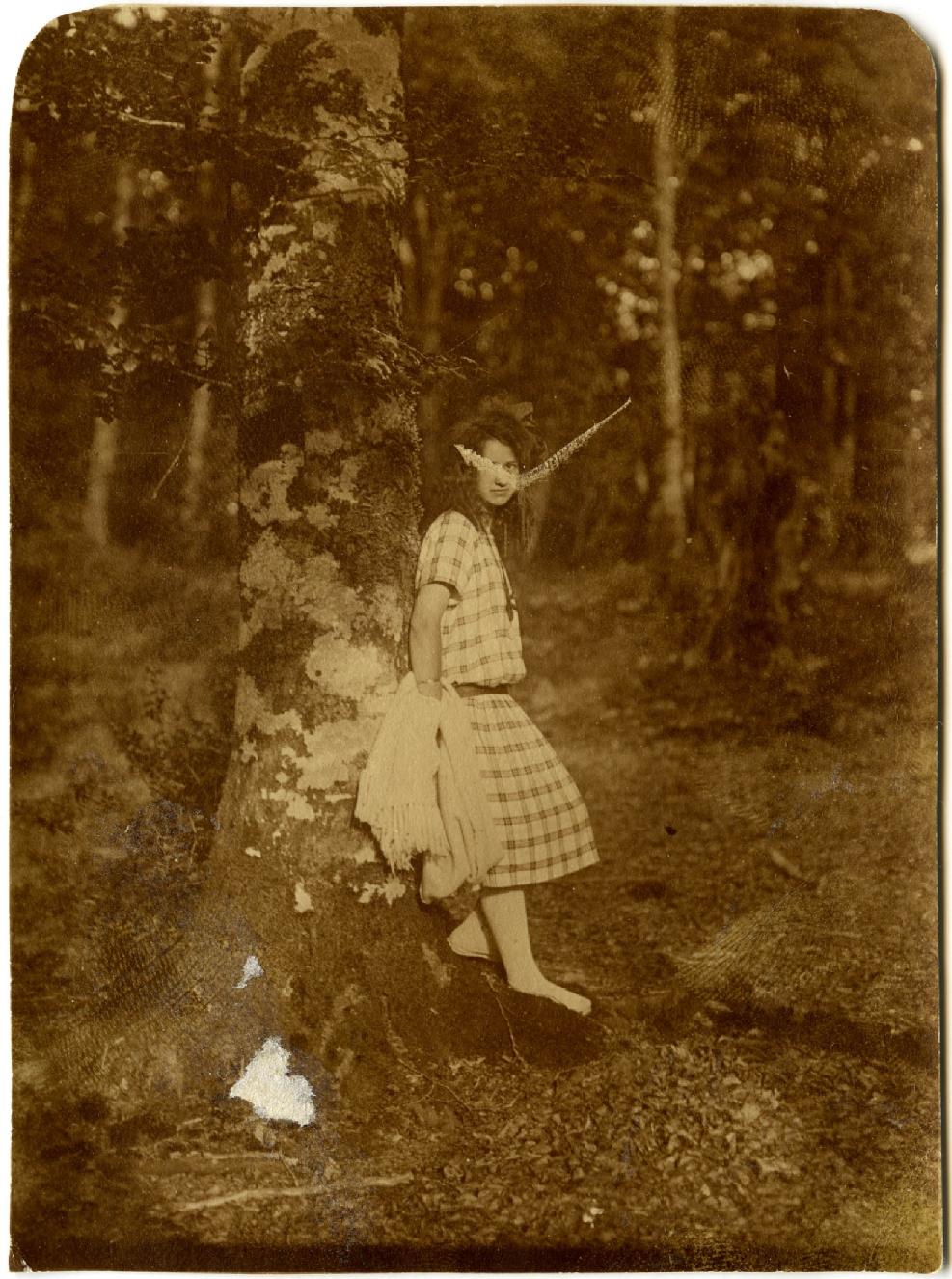 Retrato de Jenara Altadill Aldave, en pie apoyada sobre el tronco de un haya en un bosque de Burguete, tomada durante una estancia de verano de la familia Altadill Aldave.