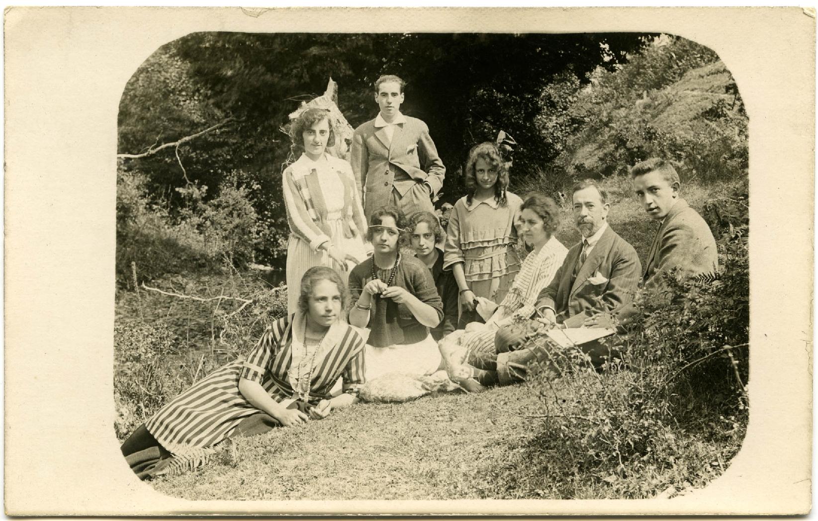 Retrato colectivo de un grupo de jóvenes excursionistas en un bosque, tomado durante una estancia de verano de la familia Altadill Aldave en Burguete. Entre los jóvenes, las hermanas María (primera fila, segunda por la izquierda) y Jenara (primera fila, en el centro, de rodillas) Altadill Aldave.
