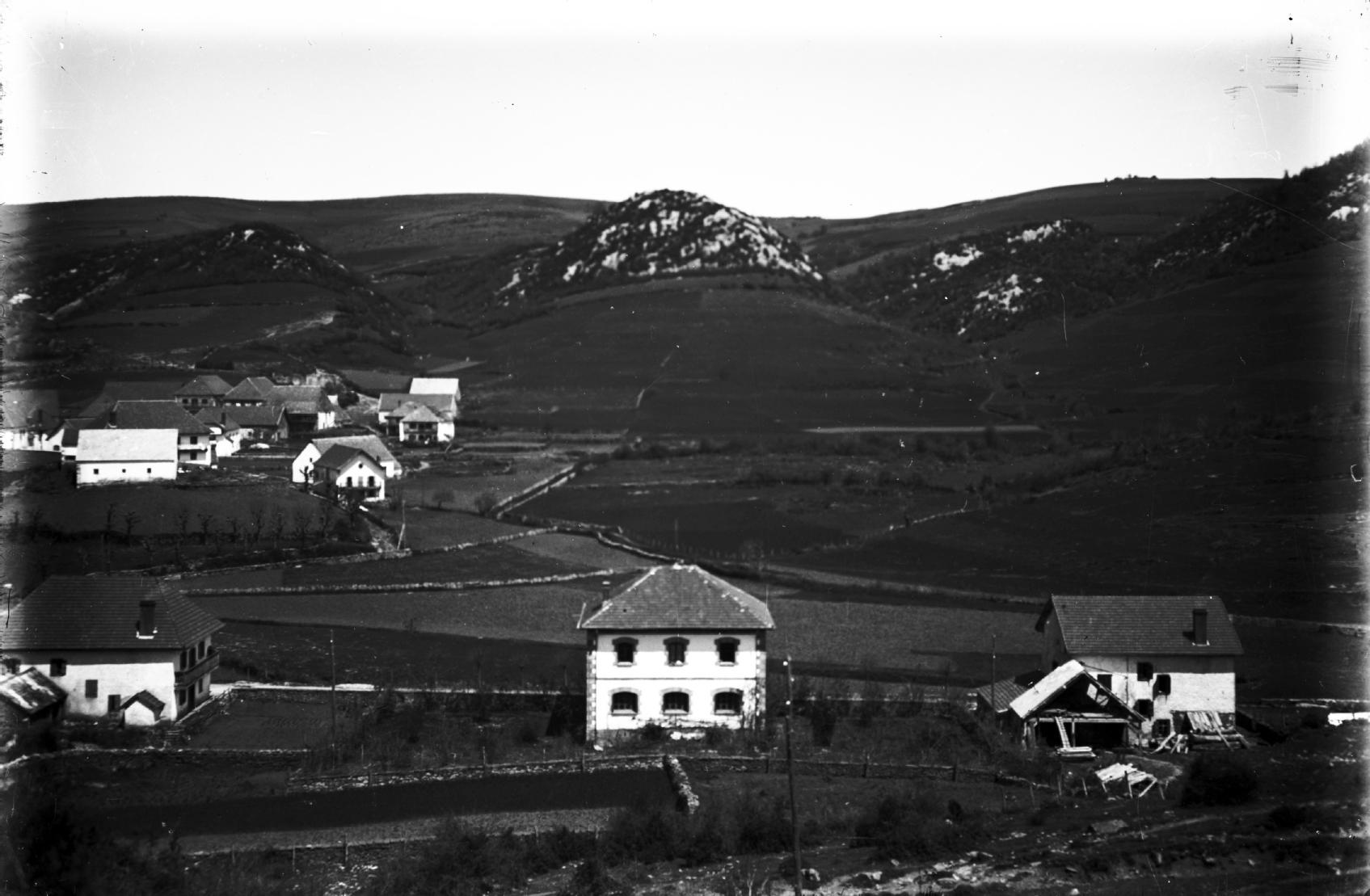 Vista parcial de la localidad de Garralda tomada desde Erremutxiloa en el sur. En el centro de la imagen casa Aróstegi, sede de la fundación Antonio Aróstegui, escuelas de la localidad y casa familiar de José Velasco Hernández, en la derecha casa Dámaso y, al fondo, el monte Atxatxuri.